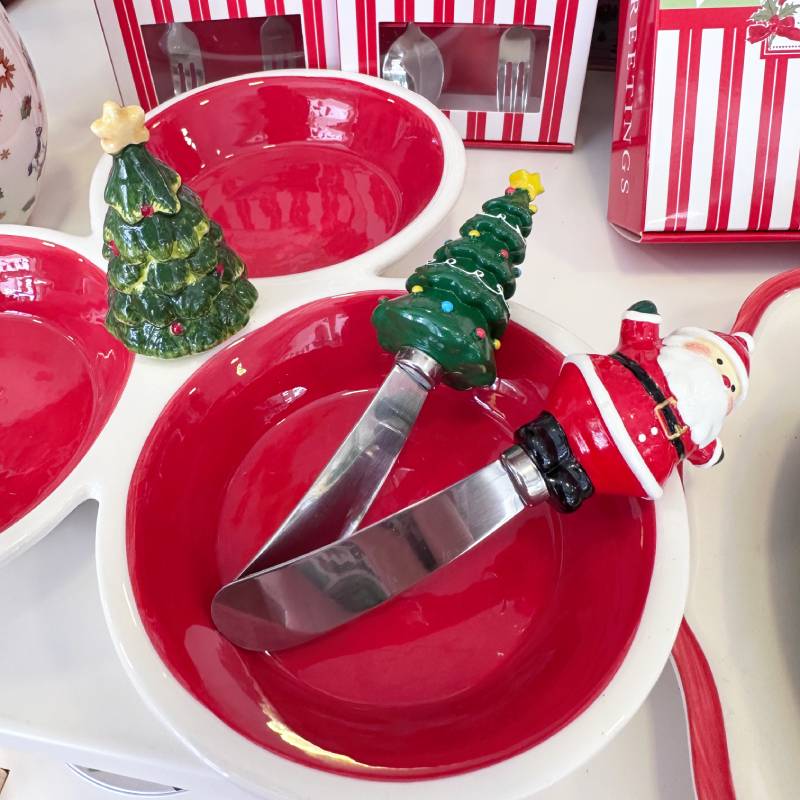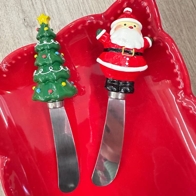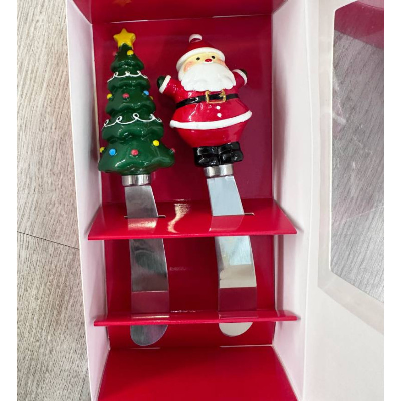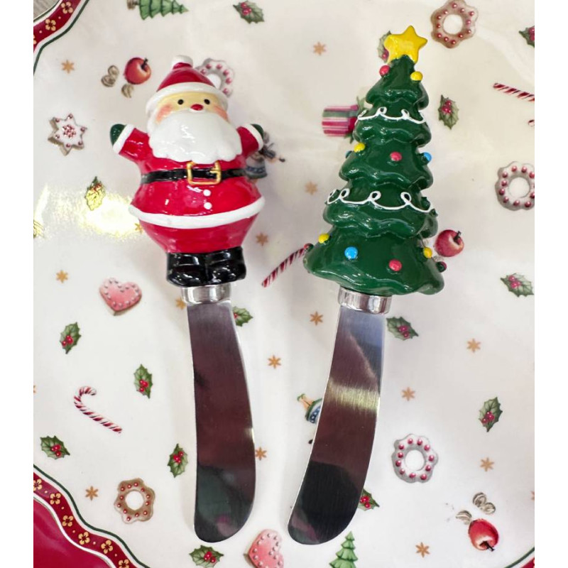 Conj. 2 facas de manteiga ou patê com cabo em forma de pai natal e pinheiro.